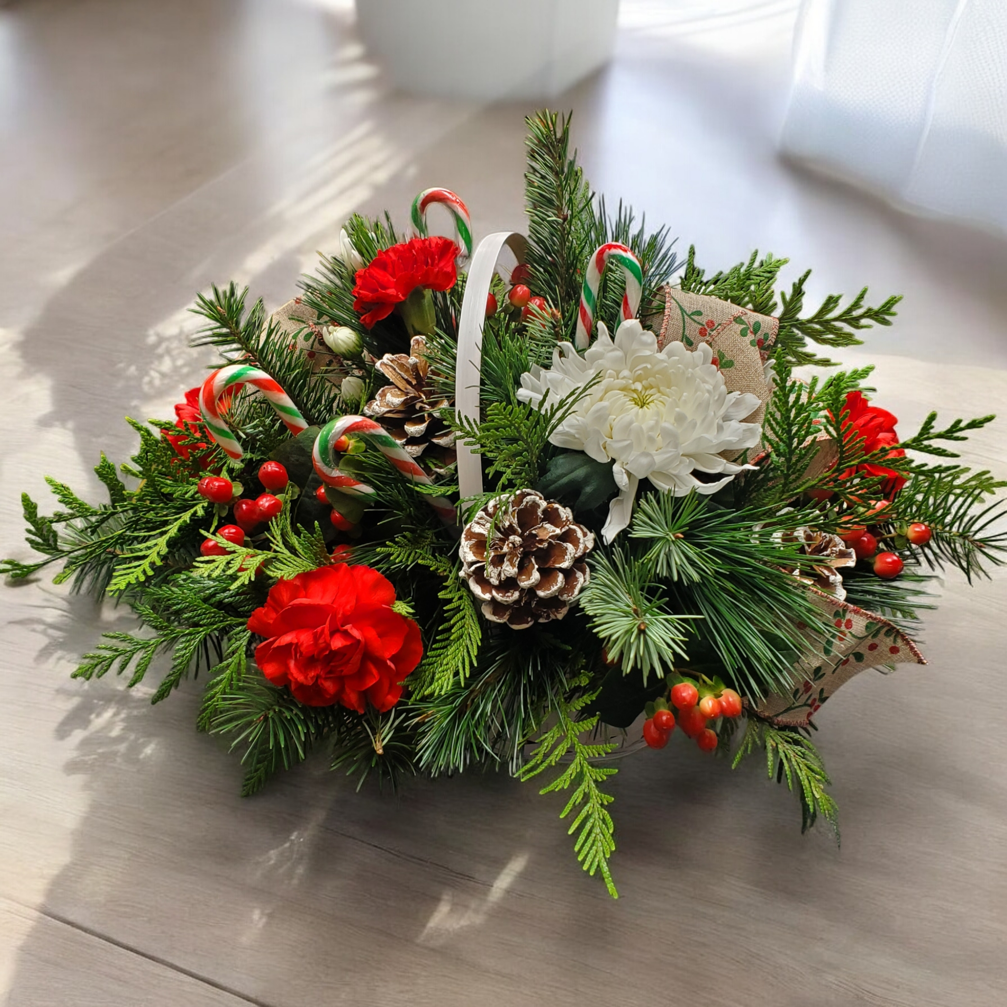 Candy canes, carnations, mums, bow, pinecone, hypericum berries, greens in a basket.